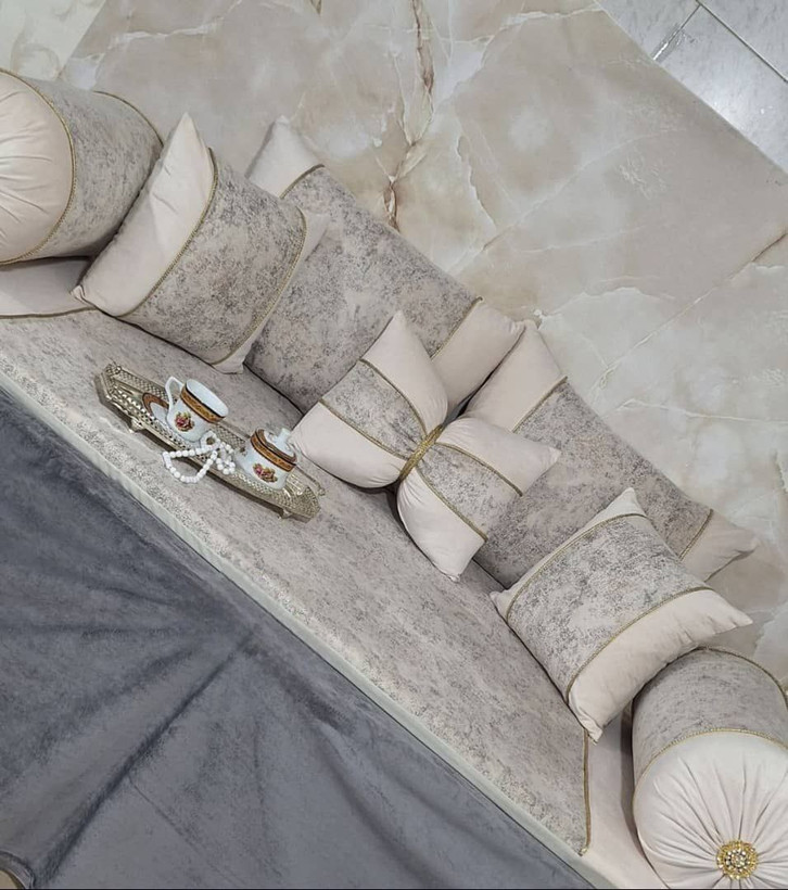 ✅ست ۸ تکه کامل شامل: دو روبالشتی، دو رو کوسنی مربع، یک کوسن پاپیونی، دو روبالش لولهای و یک تشک همه موارد پرشده است