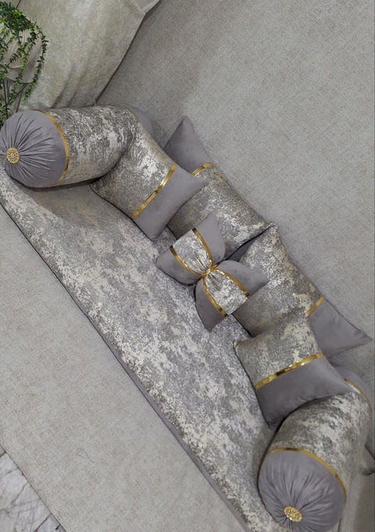 ✅ست ۸ تکه کامل شامل: دو روبالشتی، دو رو کوسنی مربع، یک کوسن پاپیونی، دو روبالش لولهای و یک تشک همه موارد پرشده است